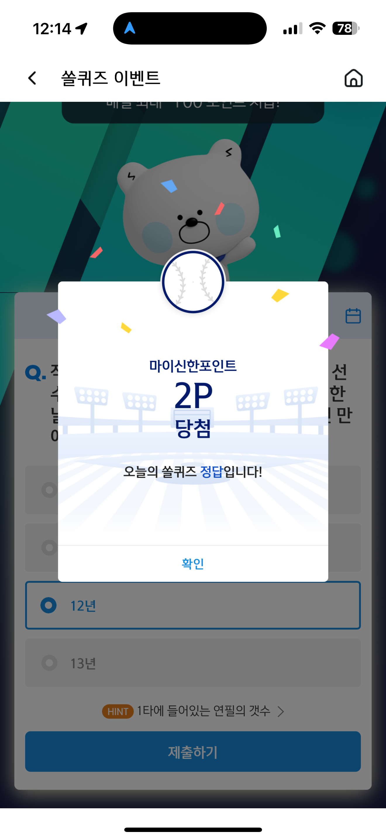 신한 슈퍼SOL 야구/상식 쏠퀴즈 정답은 12년 입니다