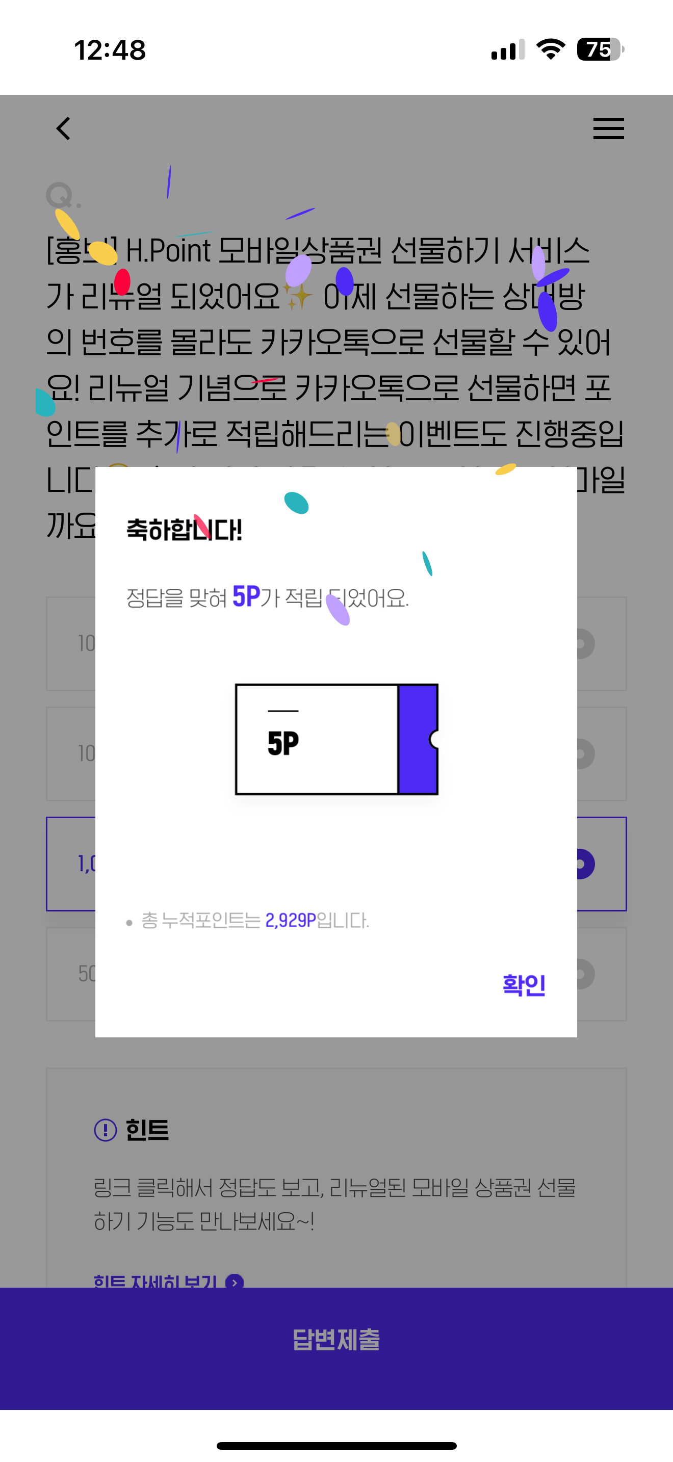 H.Point 모바일상품권 선물하기 서비스가 리뉴얼 되었어요 이제 선물하는 상대방의 번호를 몰라도 카카오톡으로 선물할 수 있어요! 리뉴얼 기념으로 카카오톡으로 선물하면 포인트를 추가로 적립해드리는 이벤트도 진행중입니다 추가 적립 받을 수 있는 포인트는 얼마일까요? 보기는 1. 10P 2. 100P 3. 1,000P 4. 50P 입니다