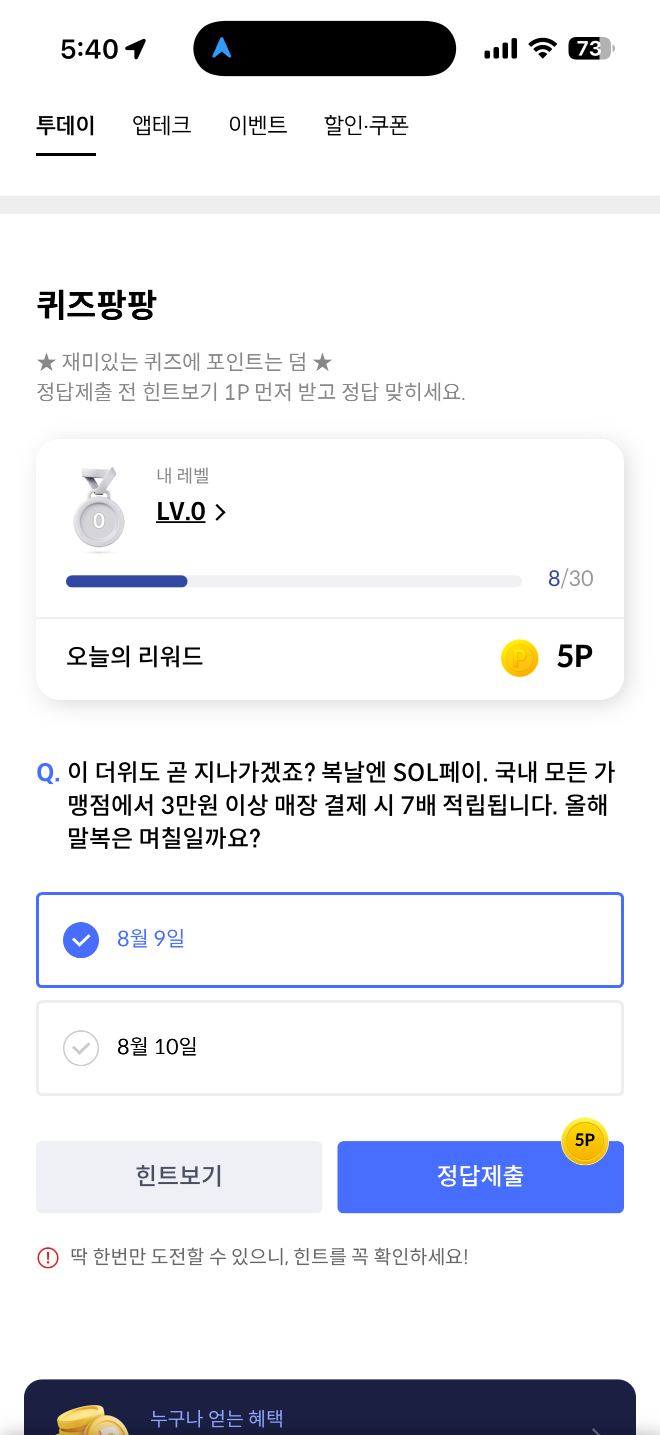 신한카드 퀴즈팡팡 정답은 8월 9일 입니다
