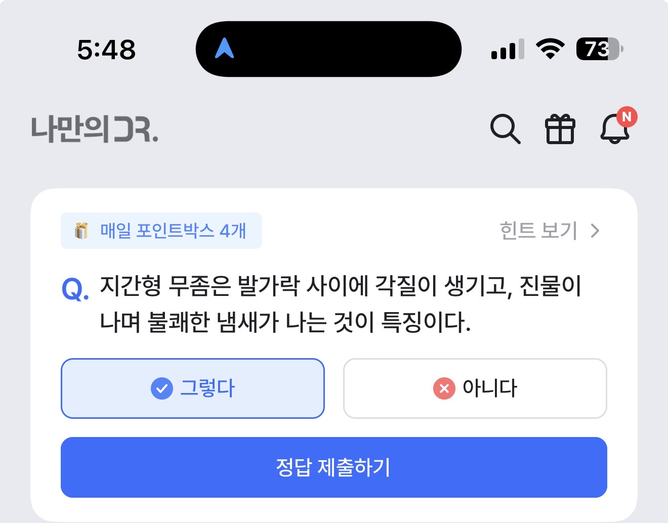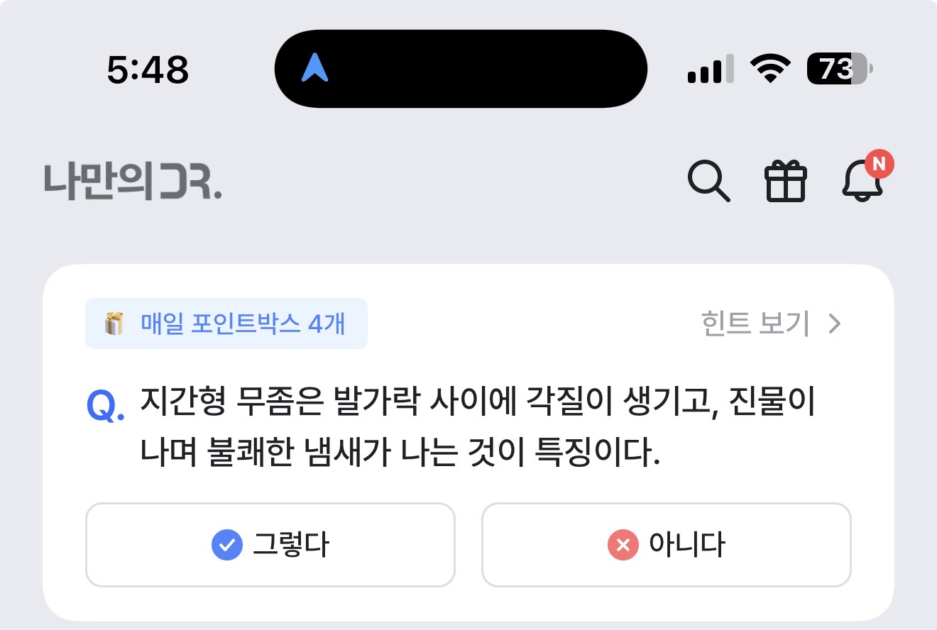 지간형 무좀은 발가락 사이에 각질이 생기고, 진물이 나며 불쾌한 냄새가 나는 것이 특징이다. 그렇다 아니다 선택하면 되는데요. 무좀은 다양한 형태가 있고 각 무좀마다 성격이 다릅니다. 잘 참고해서 무좀을 예방하거나 치료해 보세요