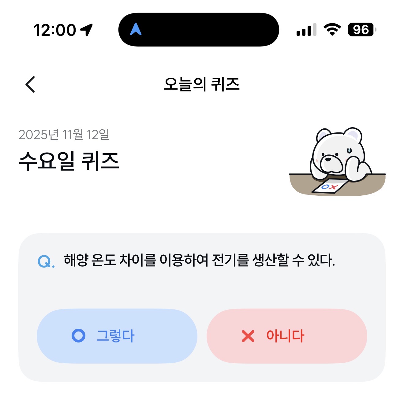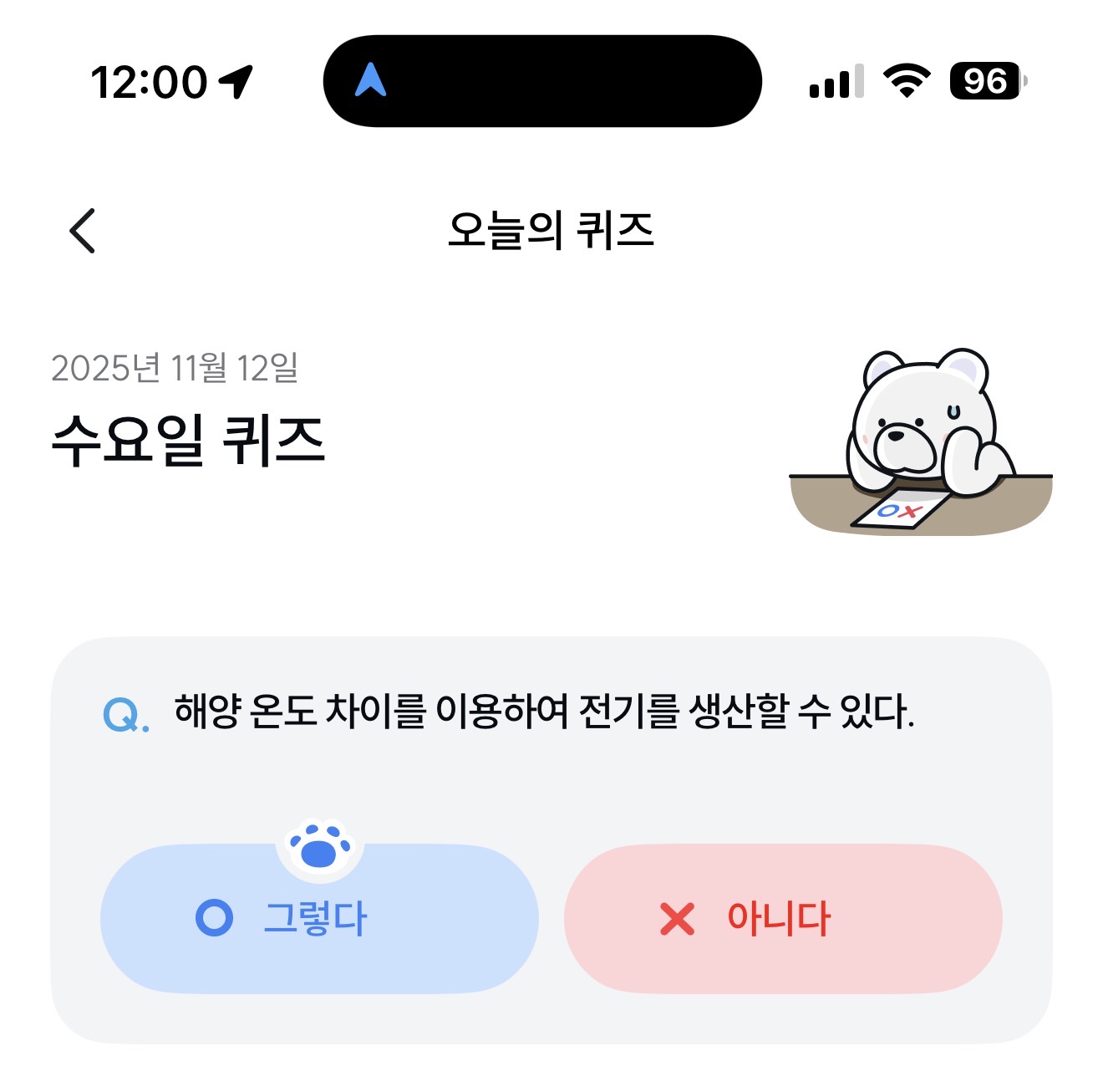 해양 온도 차이를 이용하여 전기를 생산할 수 있다. 그렇다 아니다 선택하면 되는데요. 해양 온도 차이만으로 전기를 생산할 수 있을까요? 다양한 기술들을 통해 친환경 에너지를 만들고 있는데요. 과연 해양 온도 차이로 어떻게 전기가 만들어지는지 참고해 보세요
