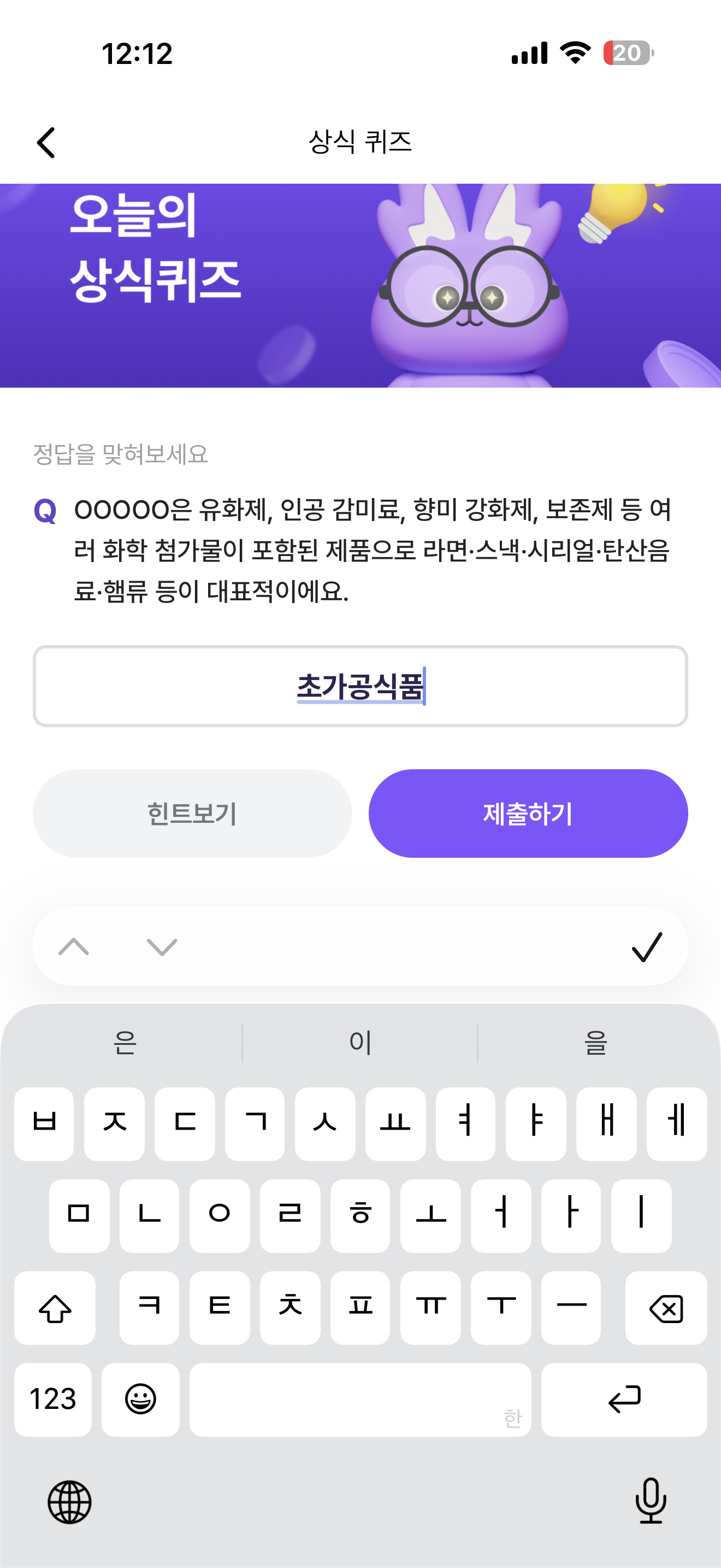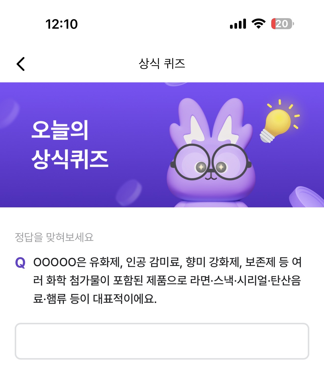 OOOOO은 유화제, 인공 감미료, 향미 강화제, 보존제 등 여러 화학 첨가물이 포함된 제품으로 라면 스낵 시리얼 탄산음료 햄류 등이 대표적이에요. 주관식 퀴즈인데요.