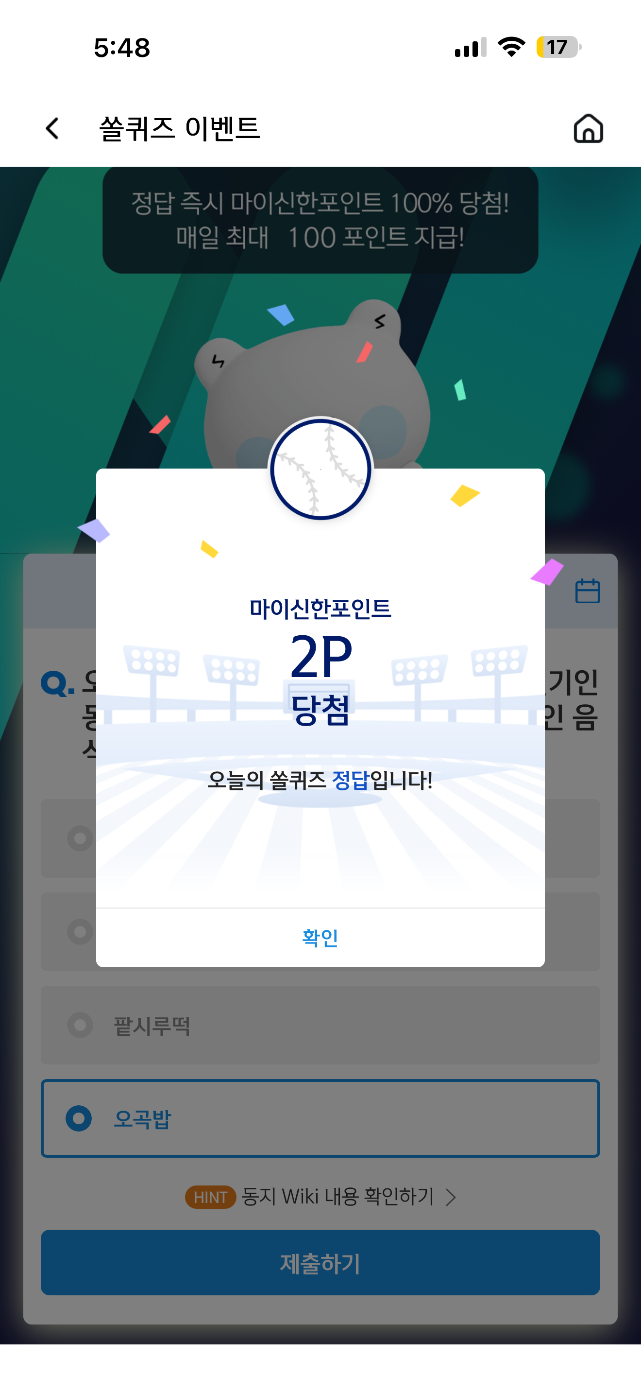 신한 슈퍼SOL 야구/상식 쏠퀴즈 정답은 오곡밥 입니다