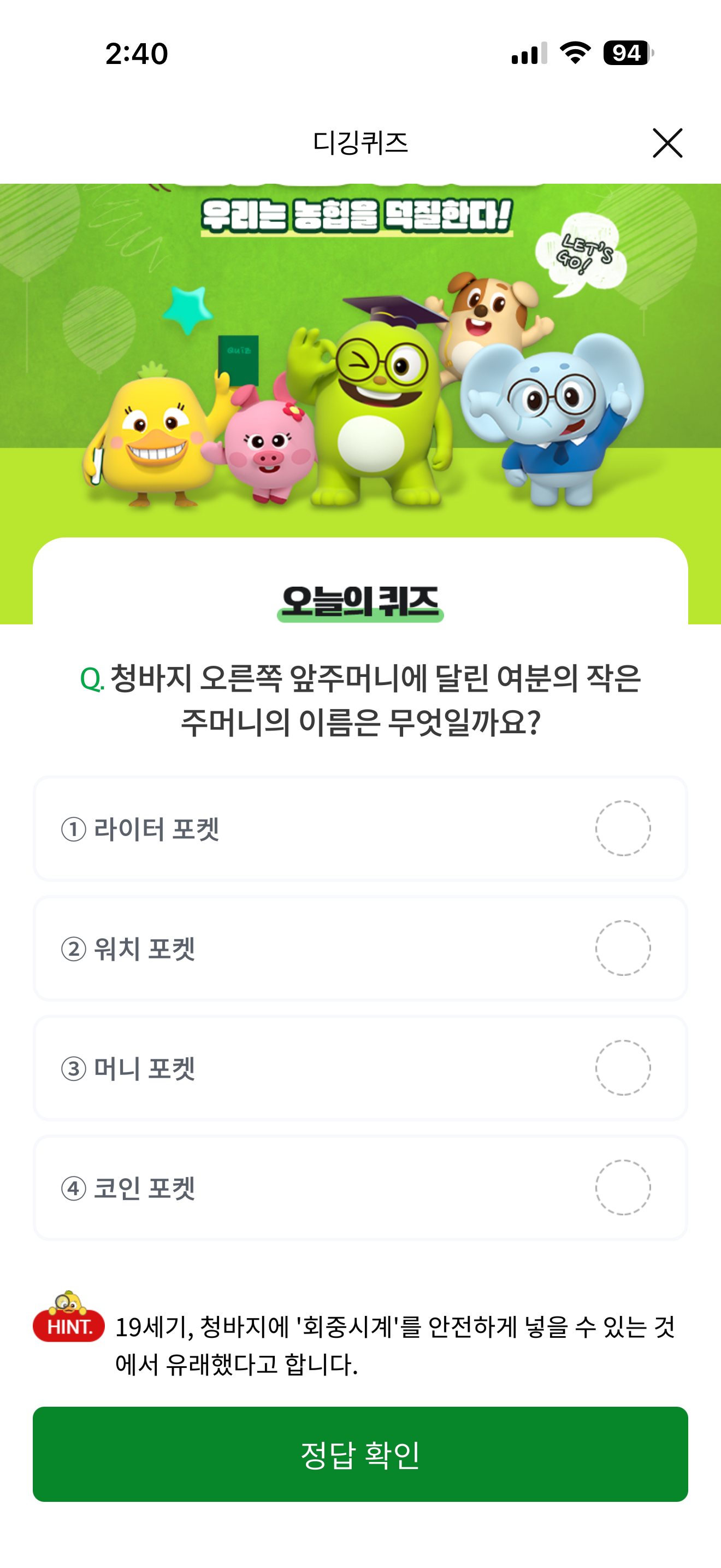 NH올원뱅크 디깅퀴즈 정답은 워치 포켓 입니다