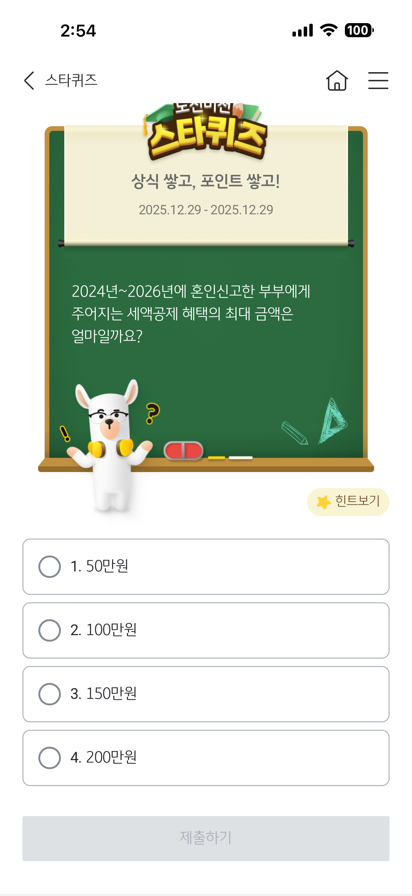 2024년~2026년에 혼인신고한 부부에게 주어지는 세액공제 혜택의 최대 금액은 얼마일까요? 보기는 1. 50만원 2. 100만원 3. 150만원 4. 200만원 입니다. 혼인신고를 한 부부에게 주어지는 세액공제 혜택은 꼭 챙겨야 하죠. 참고해 두세요