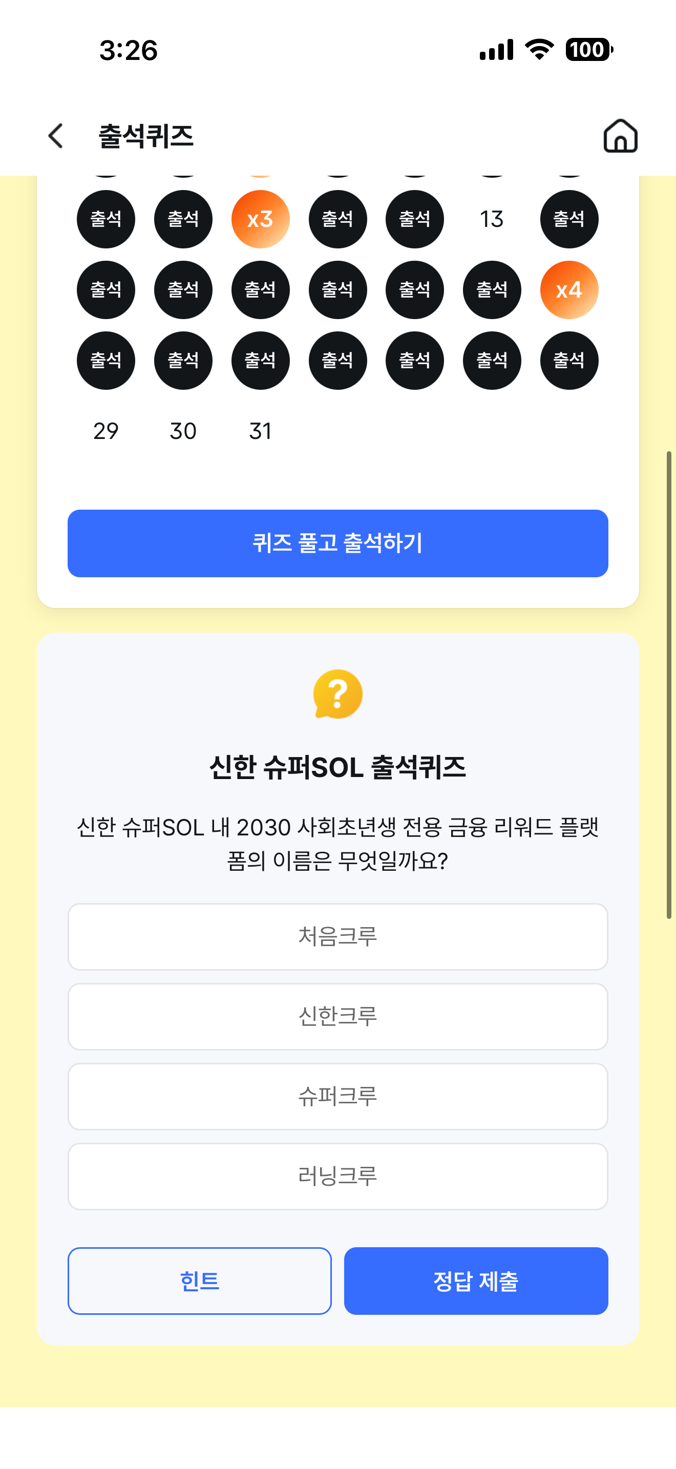신한 슈퍼SOL 출석퀴즈 정답은 처음크루 입니다