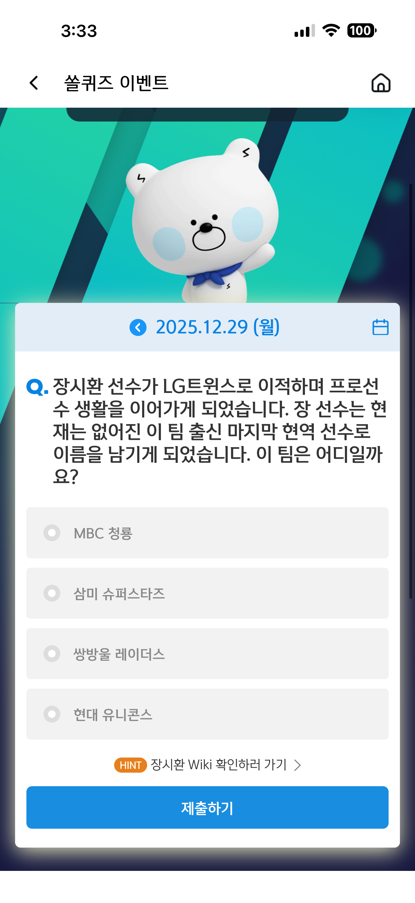 신한 슈퍼SOL 야구/상식 쏠퀴즈 정답은 현대 유니콘스 입니다