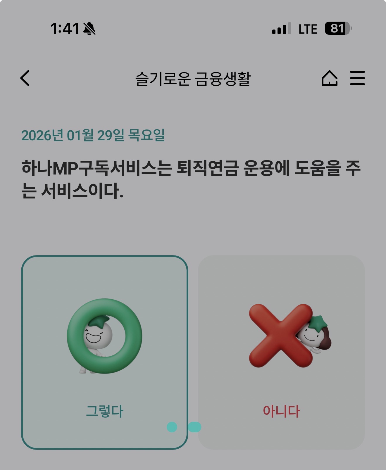 하나MP구독서비스는 퇴직연금 운용에 도움을 주는 서비스이다. 그렇다 아니다 선택하면 되는데요. 하나MP구독 서비스가 뭘까요? 퇴직연금은 노후를 위한 투자인데요. 잘 참고해 두세요