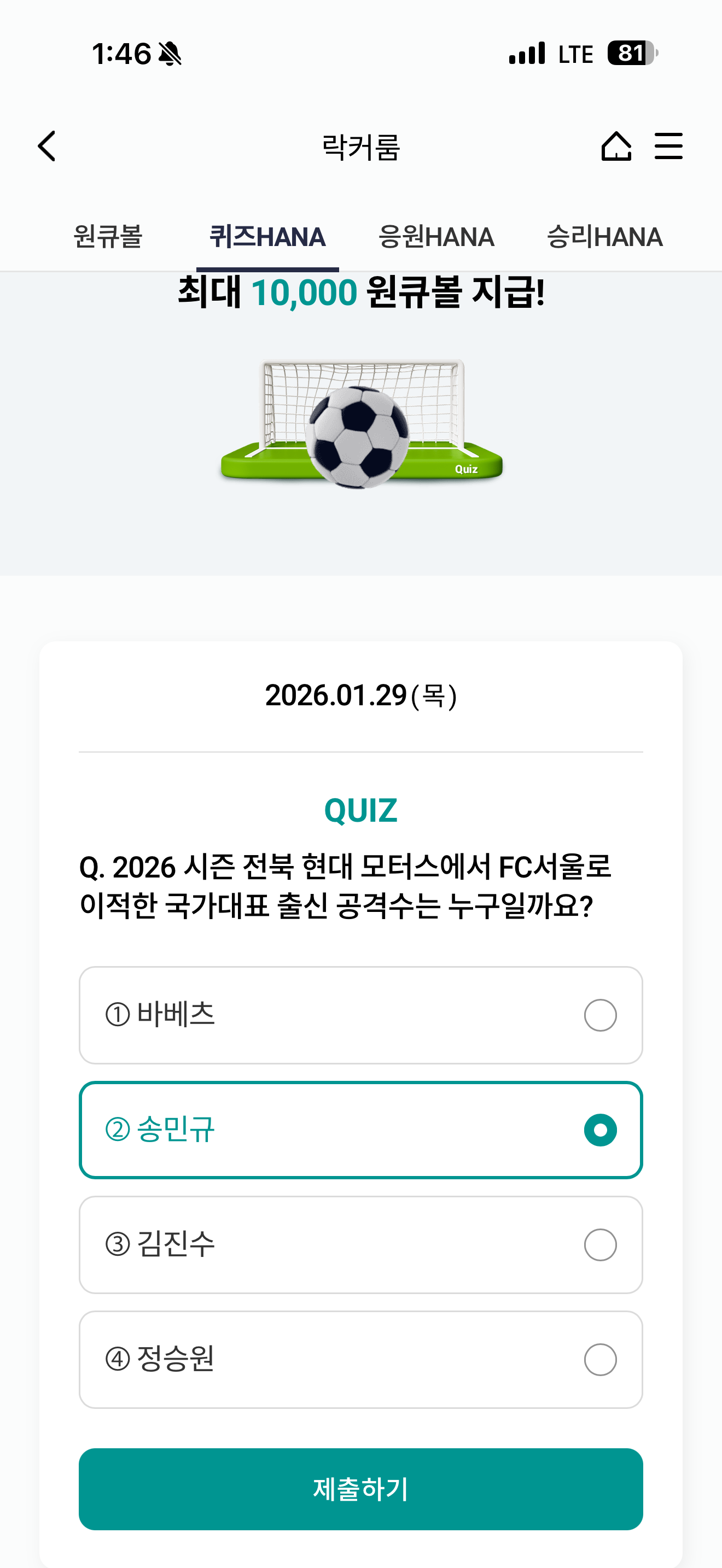 하나원큐 축구 play 퀴즈 HANA 정답은 송민규 입니다