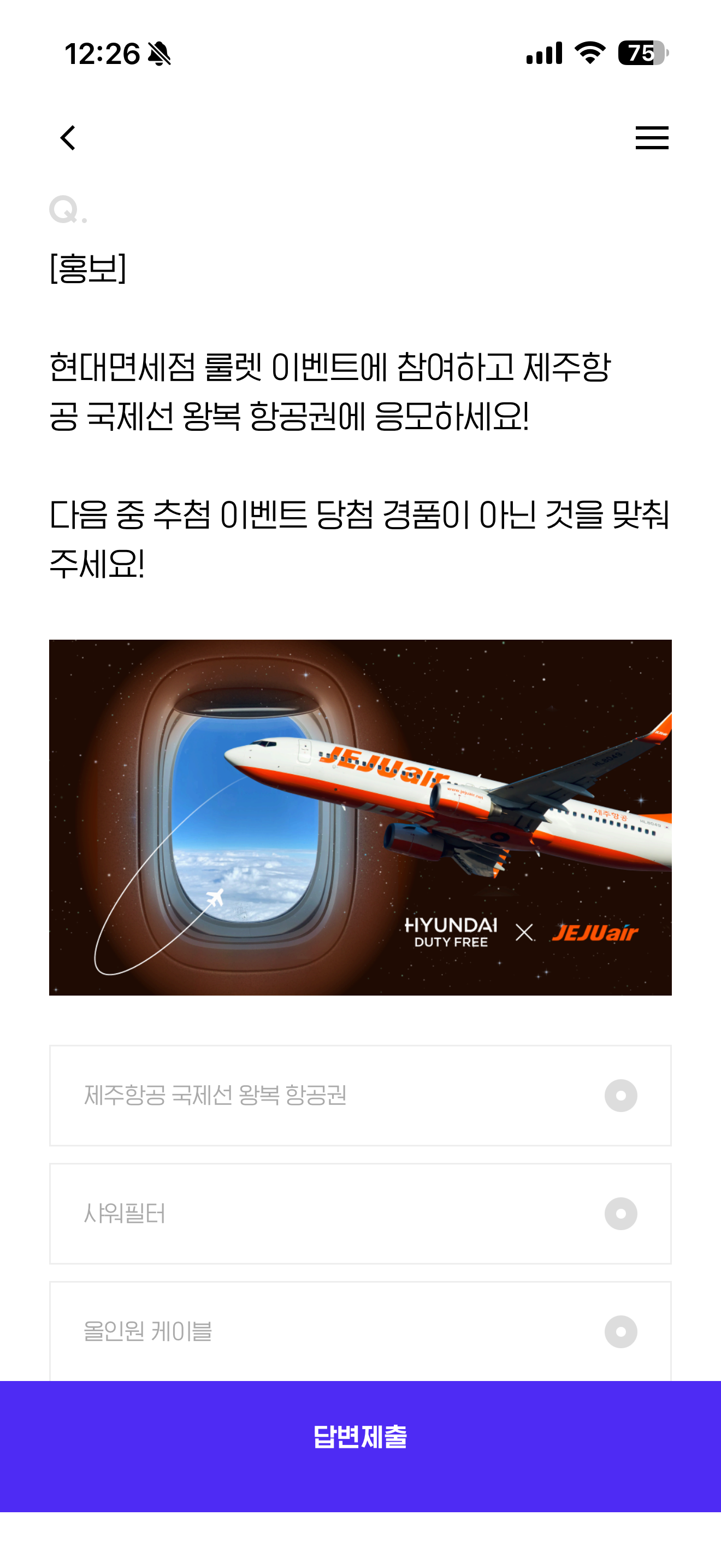 현대면세점 룰렛 이벤트에 참여하고 제주항공 국제선 왕복 항공권에 응모하세요! 다음 중 추첨 이벤트 당첨 경품이 아닌 것을 맞춰주세요! 보기는 1. 제주항공 국제선 왕복 항공권 2. 샤워필터 3. 올인원 케이블 4. 트래블 세안 키트 입니다