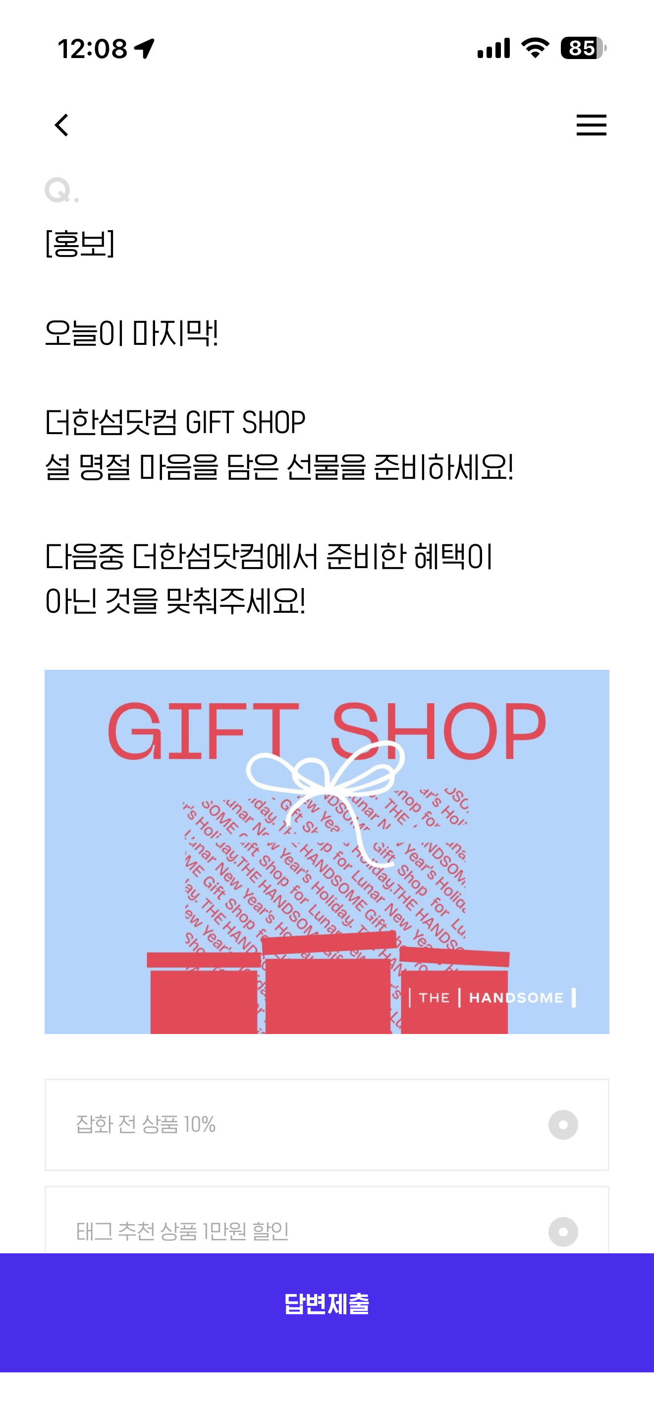 오늘이 마지막! 더한섬닷컴 GIFT SHOP 설 명절 마음을 담은 선물을 준비하세요! 다음중 더한섬닷컴에서 준비한 혜택이 아닌 것을 맞춰주세요! 보기는 1. 잡화 전 상품 10% 2. 태그 추천 상품 1만원 할인 3. 선물하기 1만 마일리지 추첨 혜택 4. H.Poit 1,000P