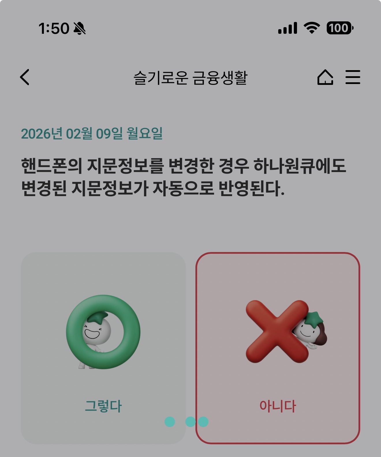핸드폰의 지문정보를 변경한 경우 하나원큐에도 변경된 지문정보가 자동으로 반영된다. 그렇다 아니다 선택하면 되는데요. 핸드폰의 지문정보를 변경하면 하나원큐에서 자동으로 반영이 될까요? 잘 참고해 두세요