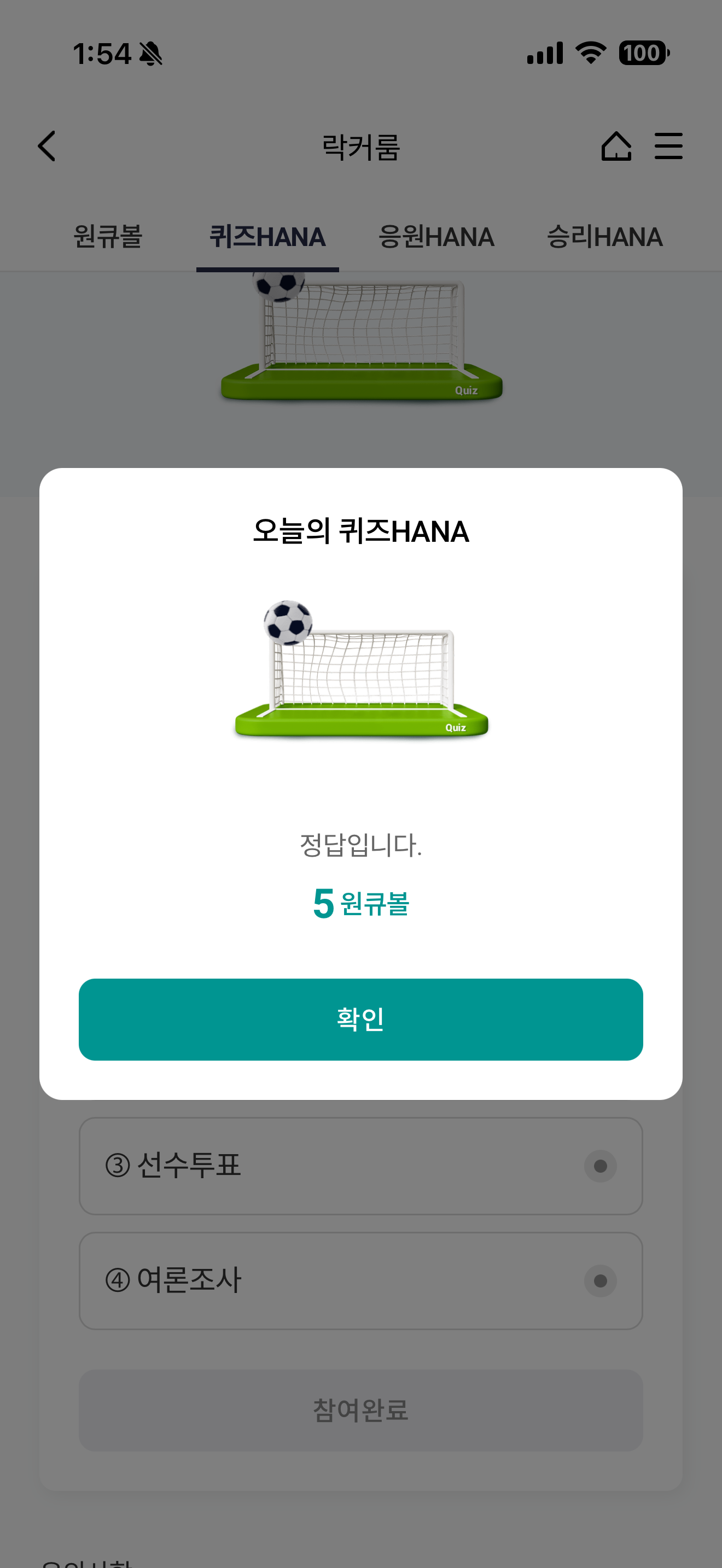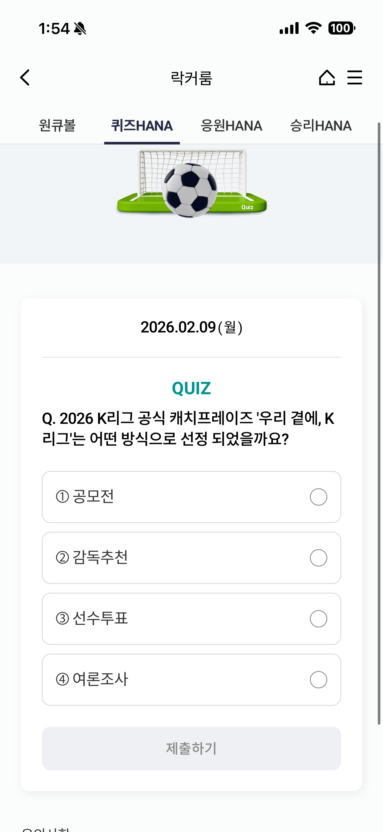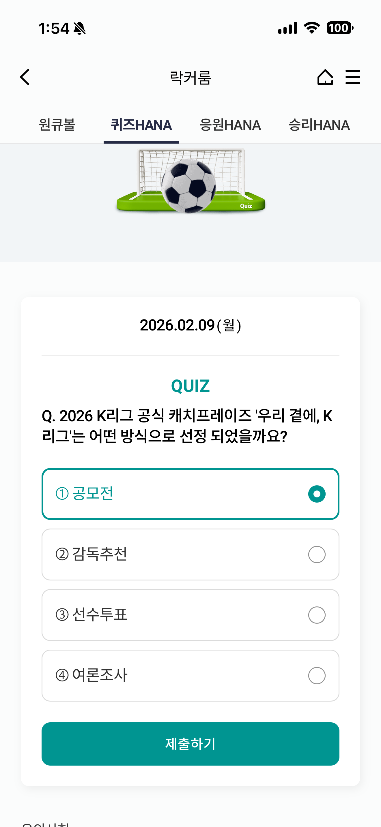 하나원큐 축구 play 퀴즈 HANA 정답은 공모전 입니다