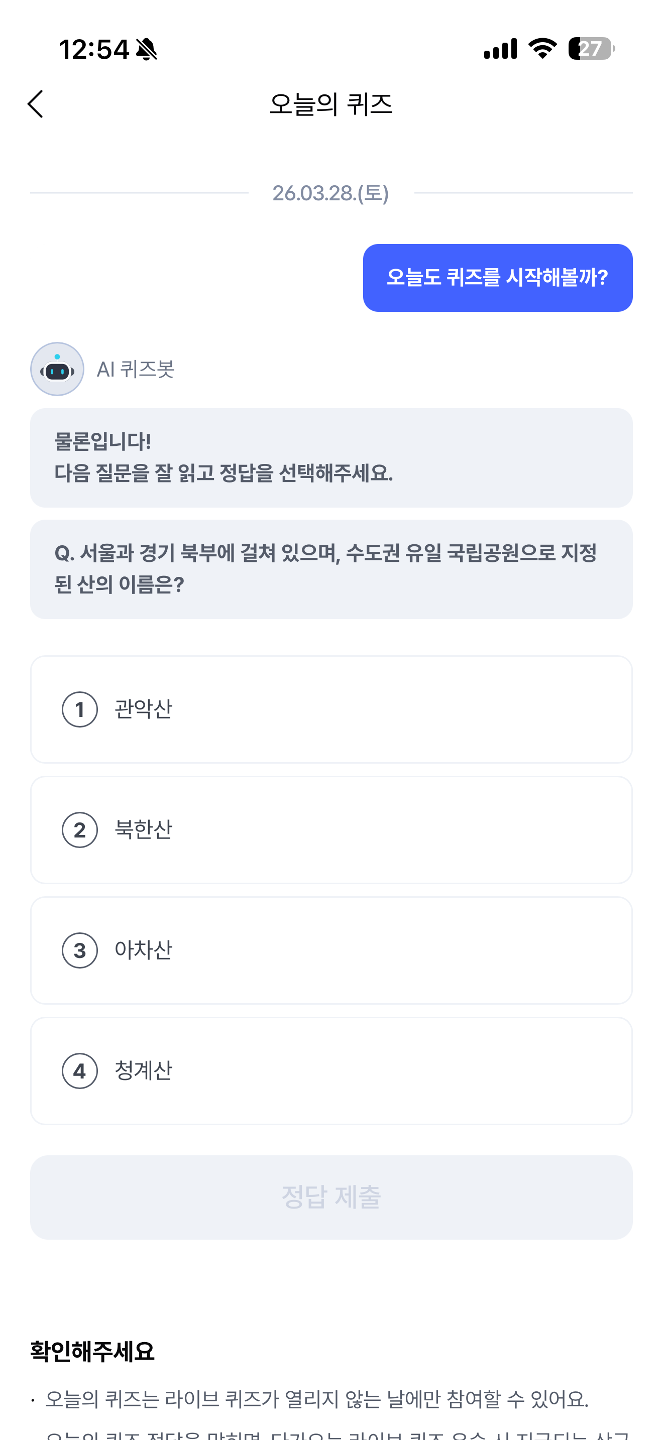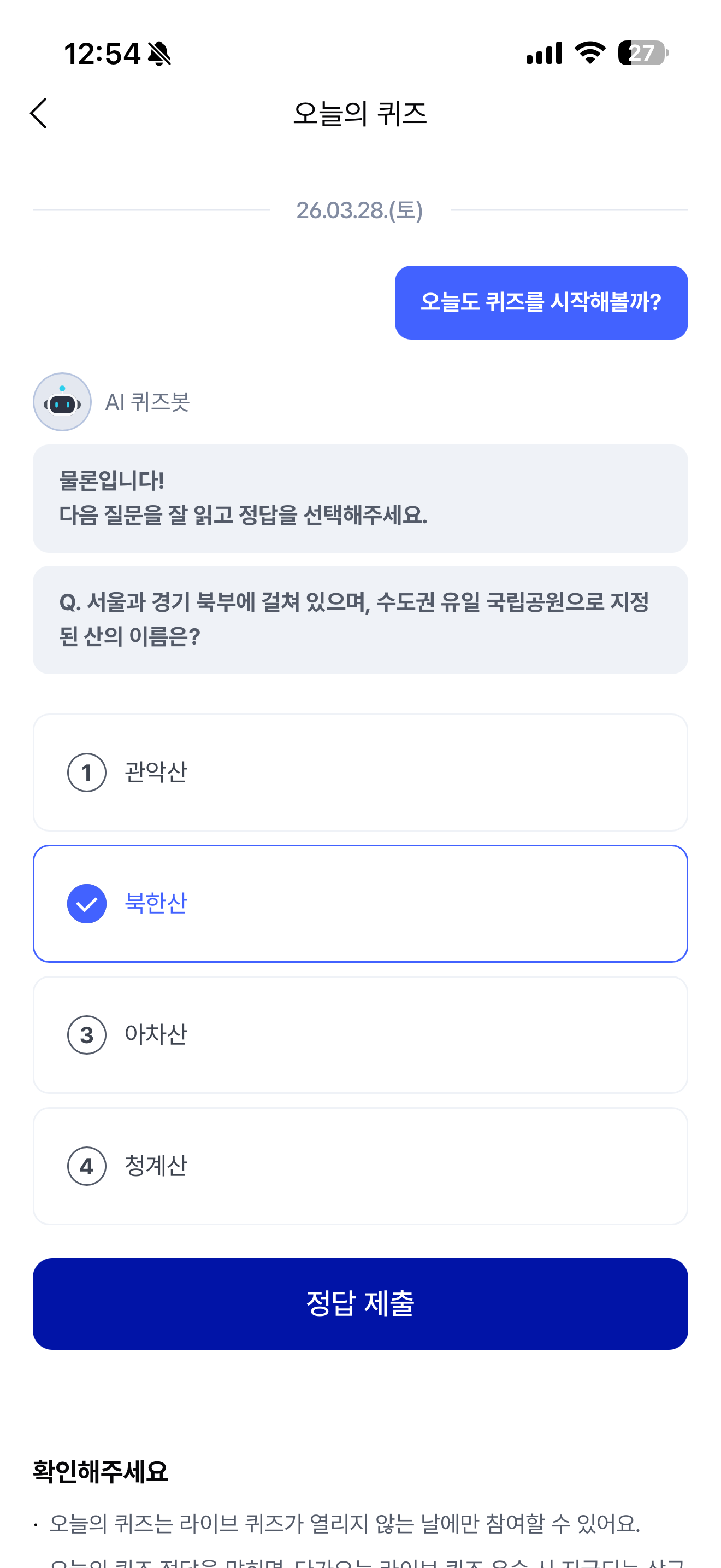 케이뱅크 AI 퀴즈 챌린지 정답은 북한산 입니다