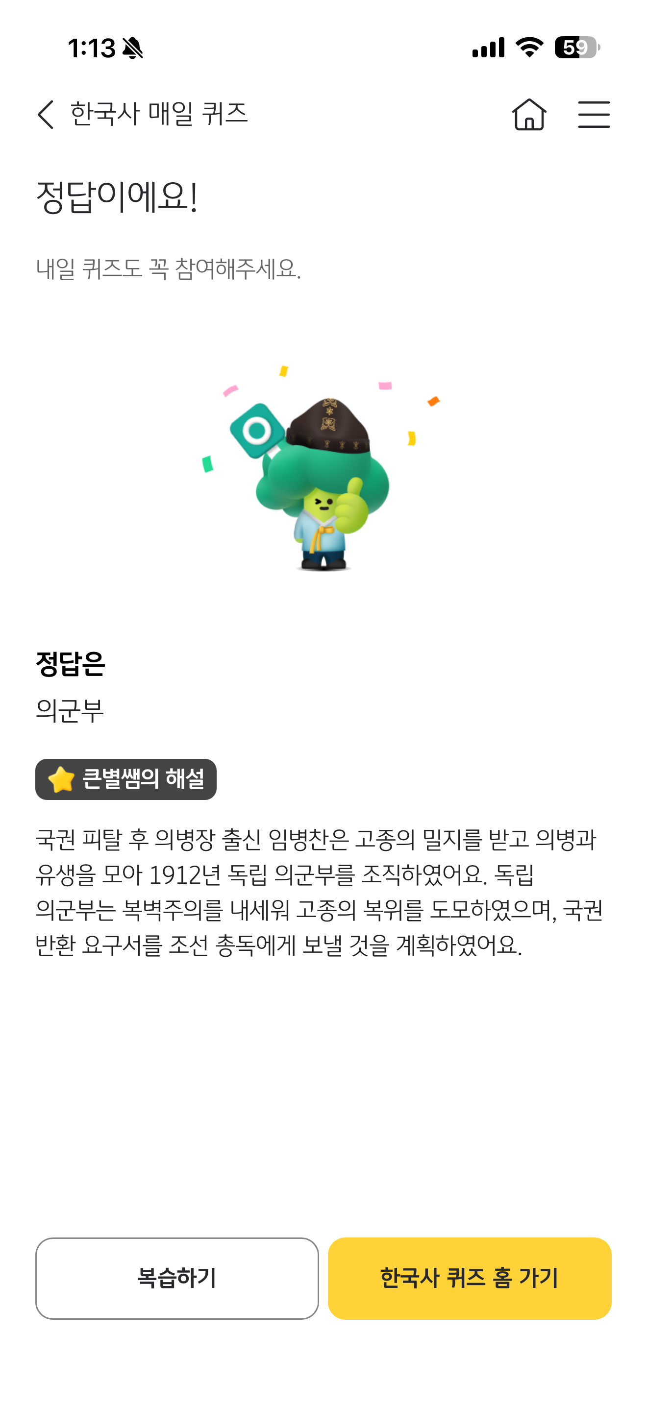 KB스타뱅킹 한국사 매일 퀴즈 정답은 의군부 입니다