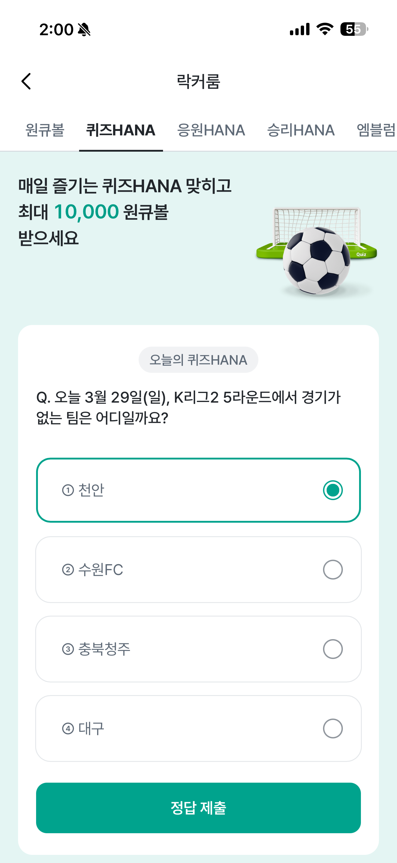 하나원큐 축구 play 퀴즈 HANA 정답은 천안 입니다