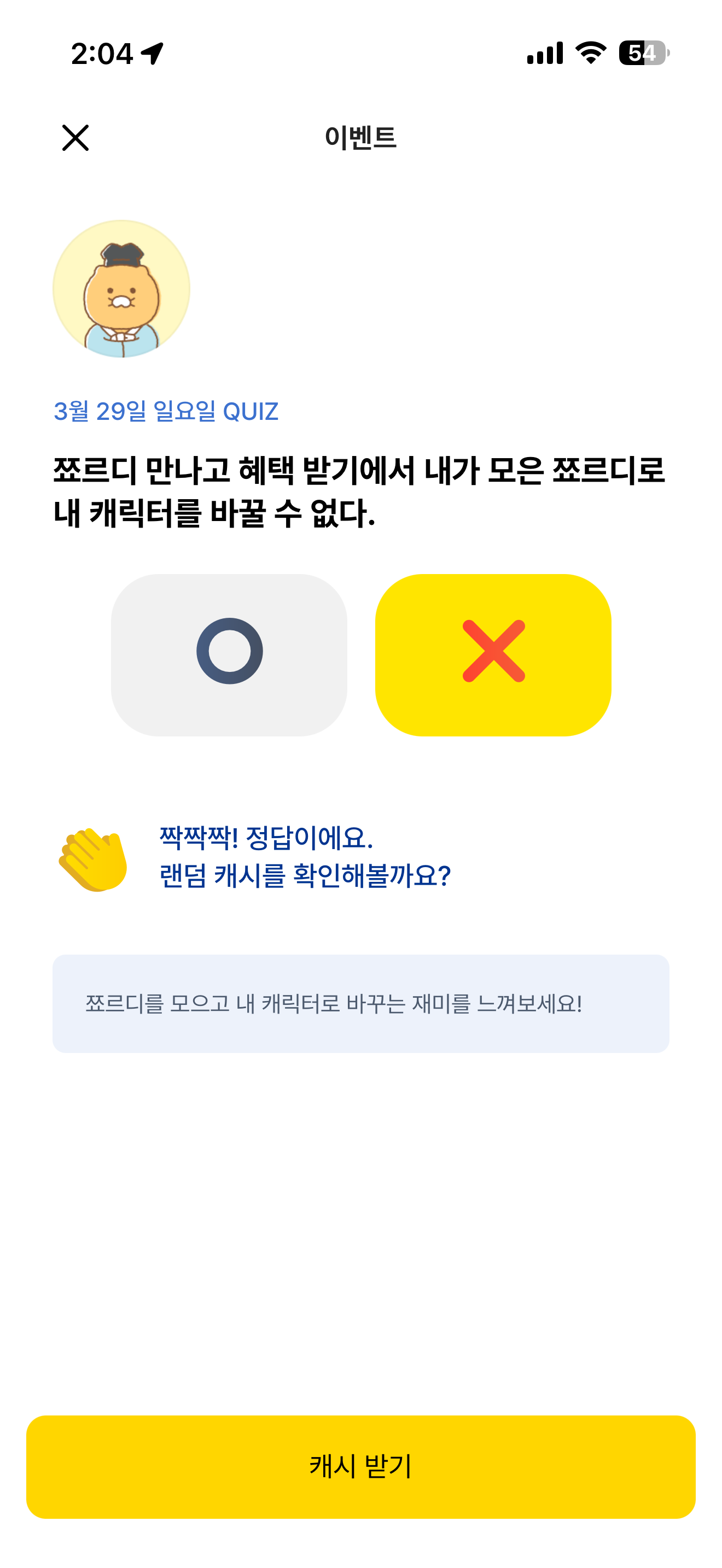 쬬르디 만나고 혜택 받기에서 내가 모은 쬬르디로 내 캐릭터를 바꿀 수 없다 O, X 퀴즈인데요.