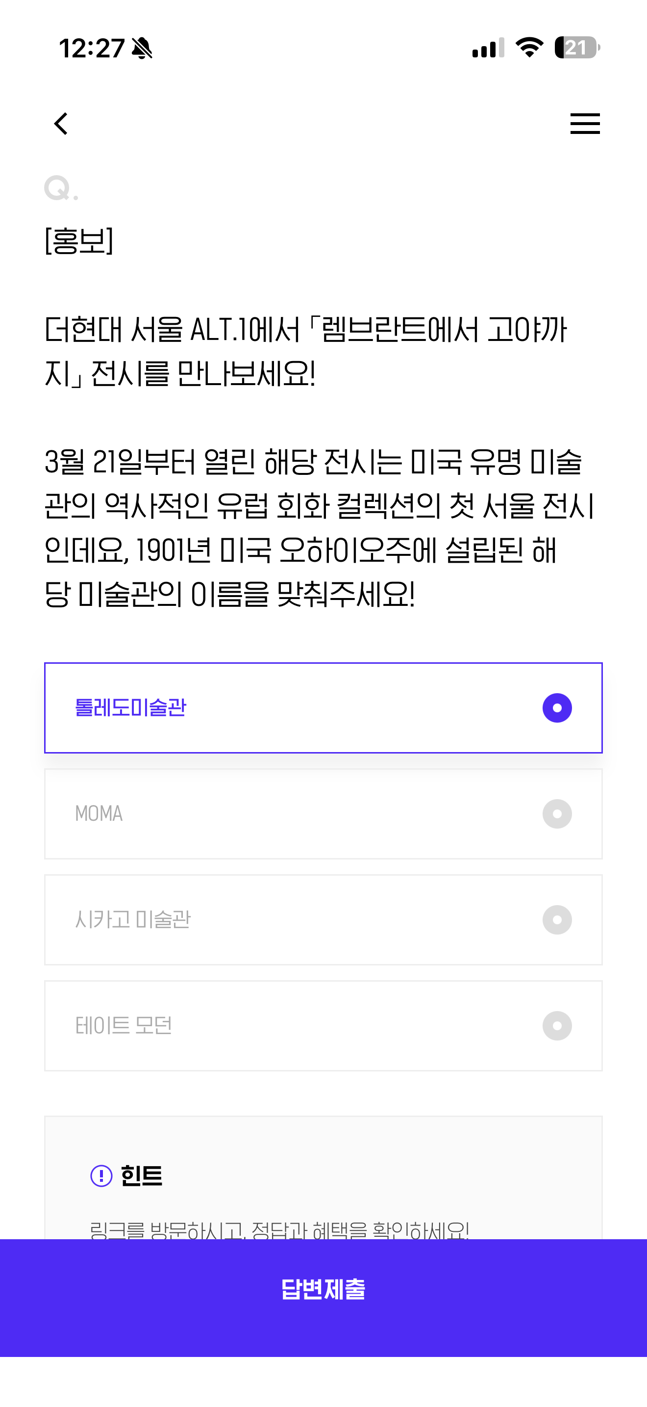 더현대 서울 ALT.1에서 렘브란트에서 고야까지 전시를 만나보세요! 3월 31일부터 열린 해당 전시는 미국 유명 미술관의 역사적인 유럽 회화 컬렉션의 첫 서울 전시인데요, 1901년 미국 오하이오주에 설립된 해당 미술관의 이름을 맞춰주세요! 보기는 1. 톨레도미술관 2. MOMA 3. 시카고 미술관 4. 테이트 모던