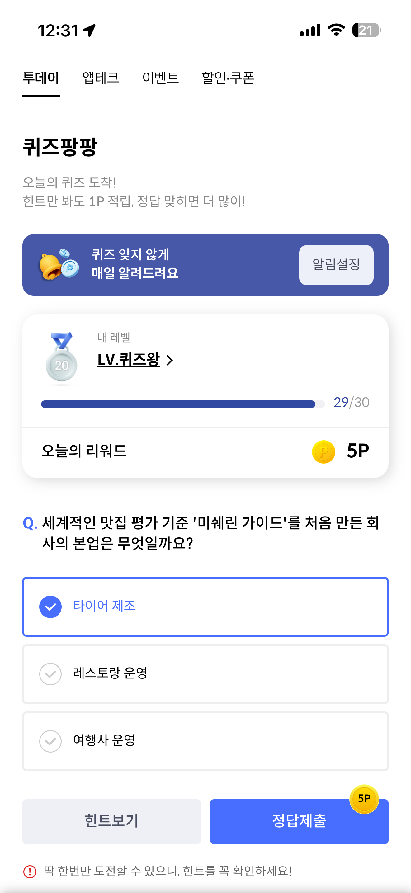 세계적인 맛집 평가 기준 '미쉐린 가이드'를 처음 만든 회사의 본업은 무엇일까요? 보기는 1. 타이어 제조 2. 레스토랑 운영 3. 여행사 운영 입니다. 세계적인 맛집 평가를 볼 수 있는 곳이죠. 우리나라에서도 이 등급을 받기 위해 수많은 레스토랑들이 노력중입니다.